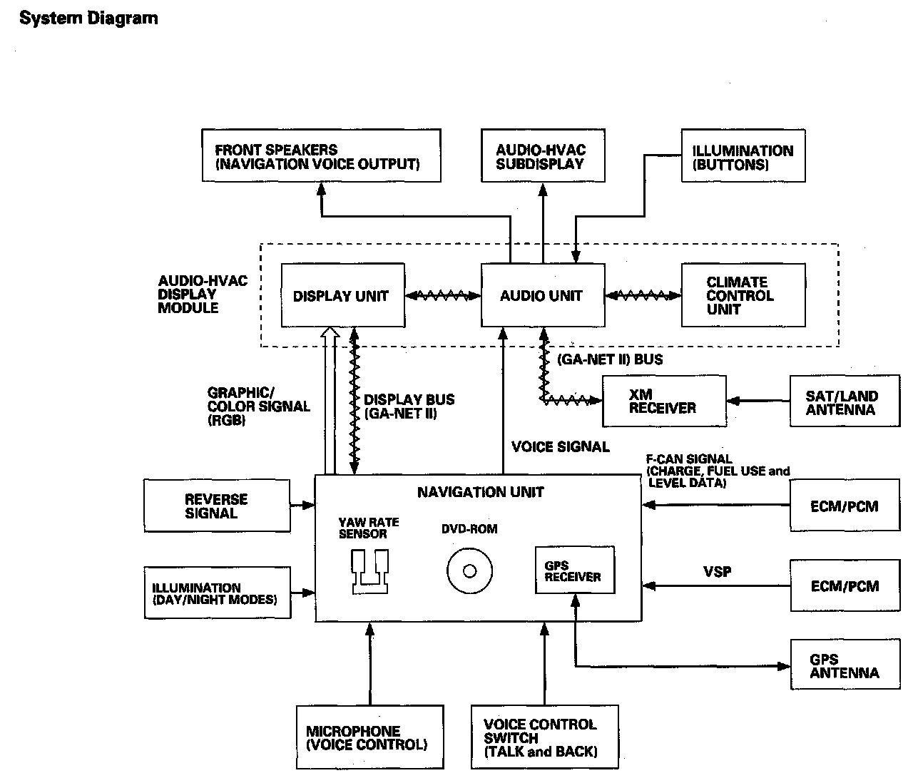 The GA-NET bus provides communication between the navigation unit and the display unit. This bus also links the components in the audio-HVAC display module. The bus is used to pass button and touch-screen commands to the navigation unit. In addition, muting and voice control commands are sent to the display unit and the audio and climate control systems for processing. The audio unit uses the bus to control the XM-receiver or other accessories.