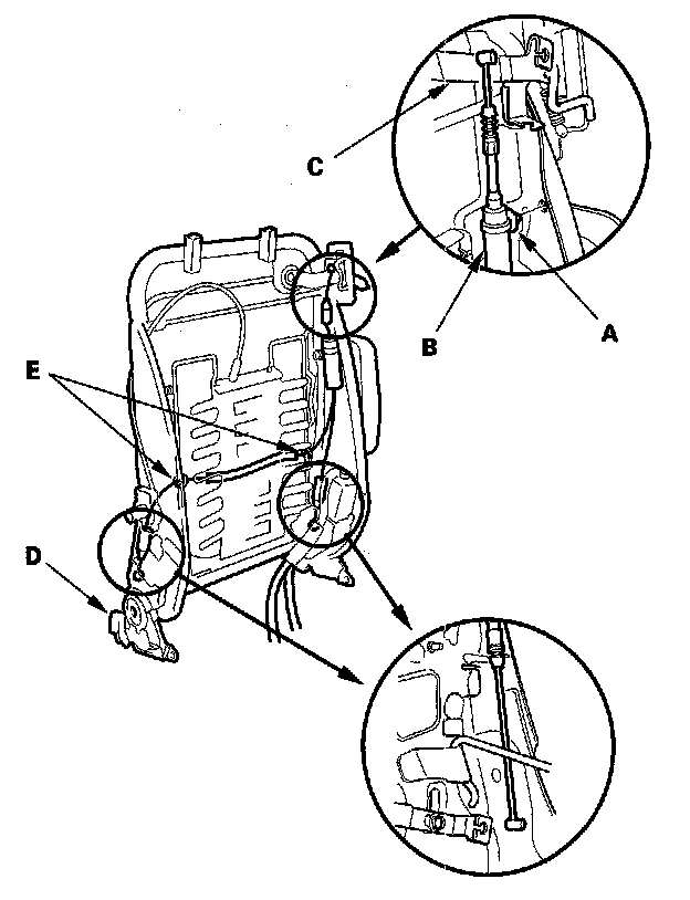 4. Detach the cable clip (A), and disconnect the rear seat access cable (B) from the rear seat access lever (C) and both recline adjusters (D). Release the wire ties (E), then remove the cable.