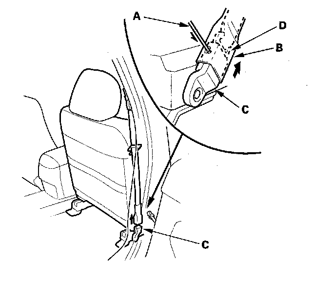 3. '04-06 models passenger's seat: Carefully insert the tip of a small screwdriver (A) through the hole in the back of the front seat belt lower anchor cover (B) and into the hole in the front seat belt lower anchor (C). Unlock the lower anchor by pushing in on the screwdriver. Remove the screwdriver, and then detach the front seat belt anchor plate (D) and anchor cover from the lower anchor.