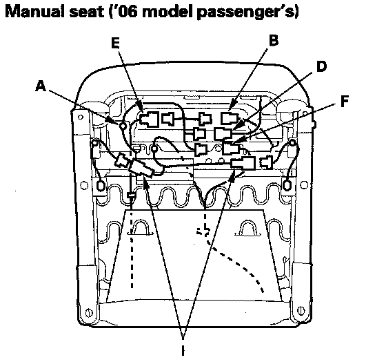 - Weight sensor unit connector (H) ('04-05 models), weight sensor connector (I) ('06 model) on the passenger's seat.