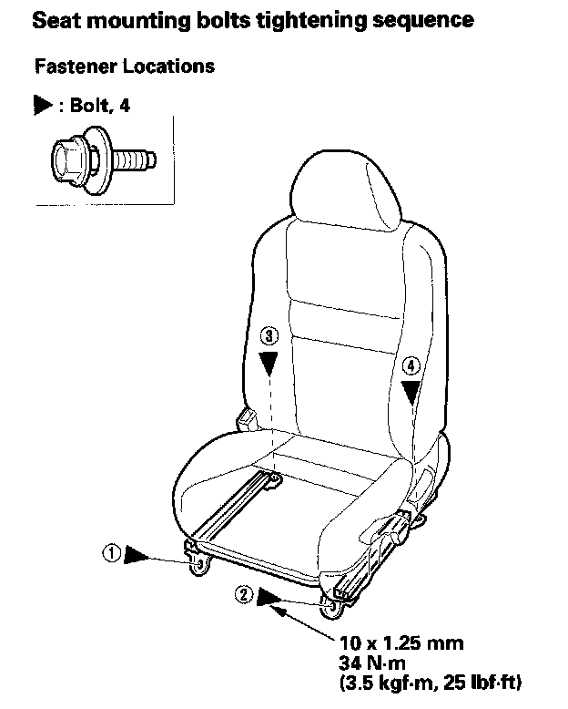 - Tighten the seat mounting bolts to the specified torque in the sequence shown. Slide the seat all the way back and tighten (1) and (2), then slide it forward and tighten (3) and (4).