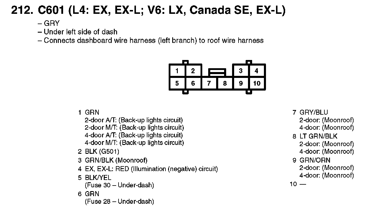 212. C601 (L4: EX, EX-L; V6: LX, Canada SE, EX-L):