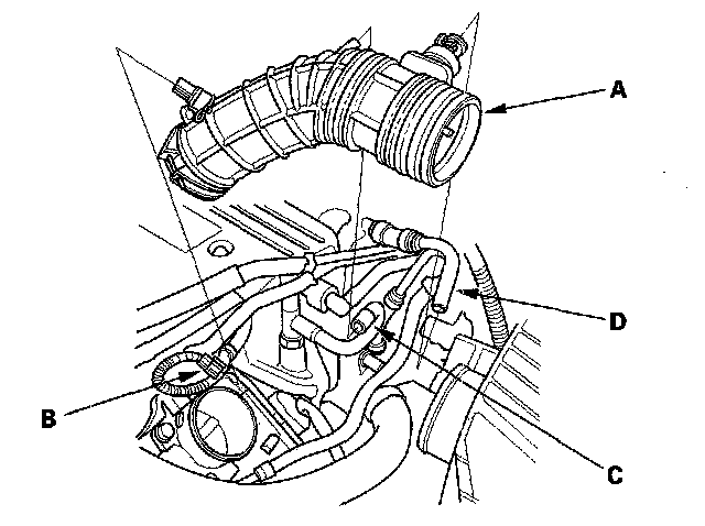 2. Remove the vacuum hose (B) and breather pipe (C), then remove the intake air duct (D).