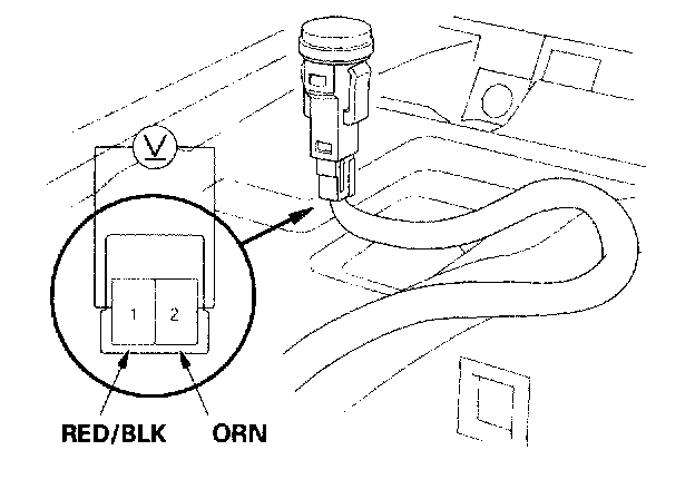 2. Turn the ignition switch ON (II). Measure the voltage between the terminals with the (+) probe on the No.1 terminal and the (-) probe on the No.2 terminal with the 2P connector connected. The voltage readings will not change under the light of a flashlight or a fluorescent lamp. Voltage should be: