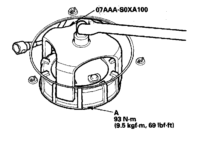 7. Using the special tool, loosen the fuel tank unit locknut (A).