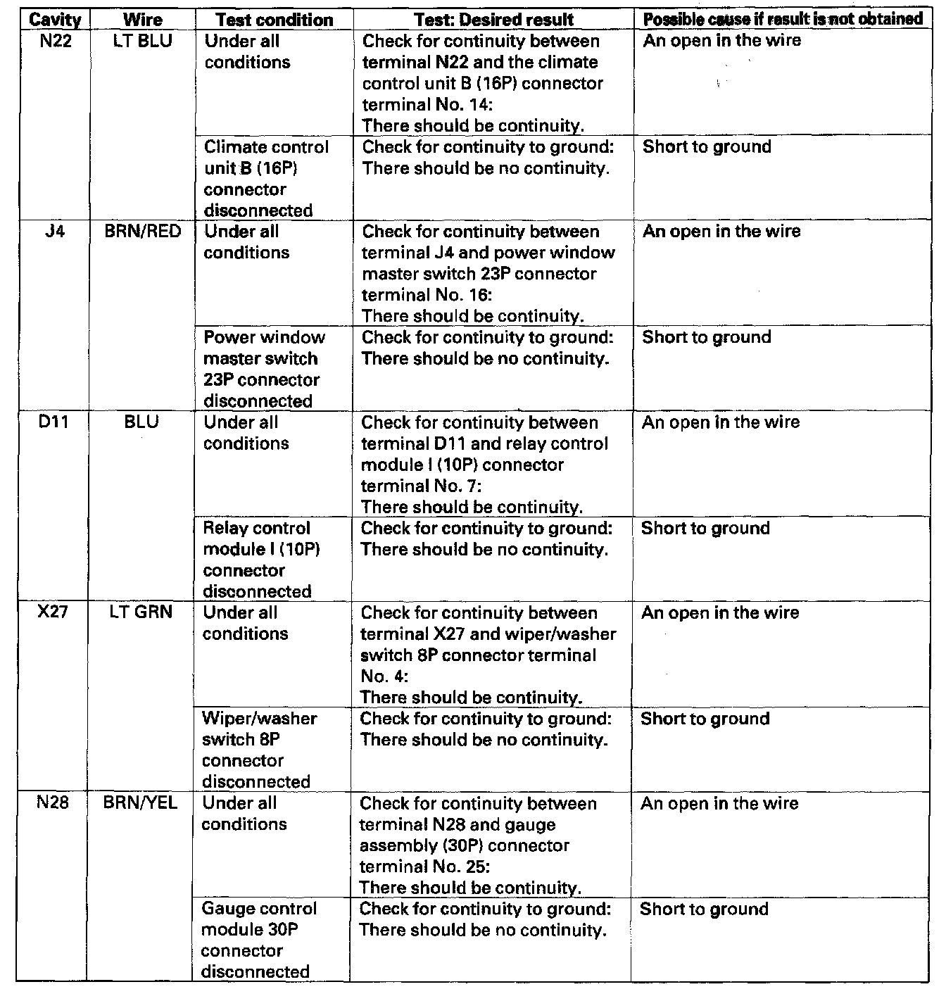 5. Disconnect the under-dash fuse/relay box connectors D, J, N and X, and make these input tests at the connector(s).