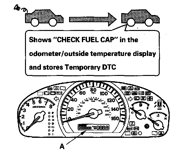 During the first drive cycle after a cold start, the ECM/PCM alerts the driver to check the fuel fill cap by showing a "CHECK FUEL CAP" message in the odometer/outside temperature display (A), and it stores Temporary DTC P0457 "Evaporative Emission (EVAP) System Leak Detected/Fuel Cap Loose or Missing". Tightening the fuel cap does not make the message go off immediately.