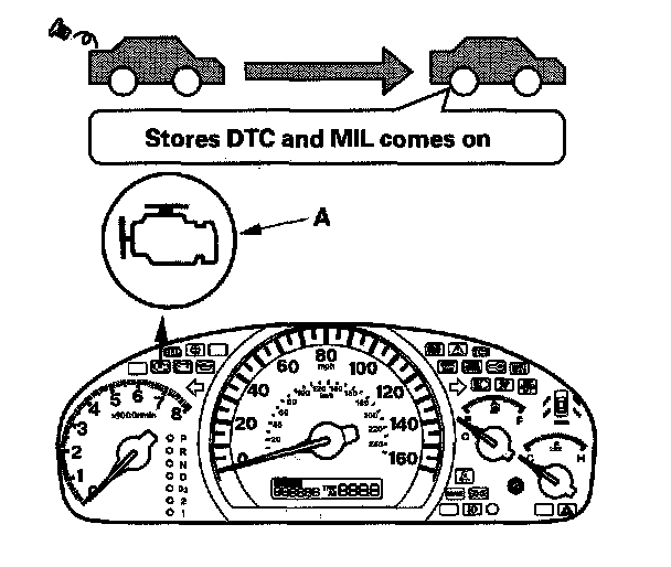 During the third drive cycle after a cold start, if the fuel fill cap is still loose or missing, the ECM/PCM stores DTC P0457 "Evaporative Emission (EVAP) System Leak Detected/Fuel Cap Loose or Missing". The malfunction indicator lamp (MIL) (A) comes on, and the "CHECK FUEL CAP" message goes off.