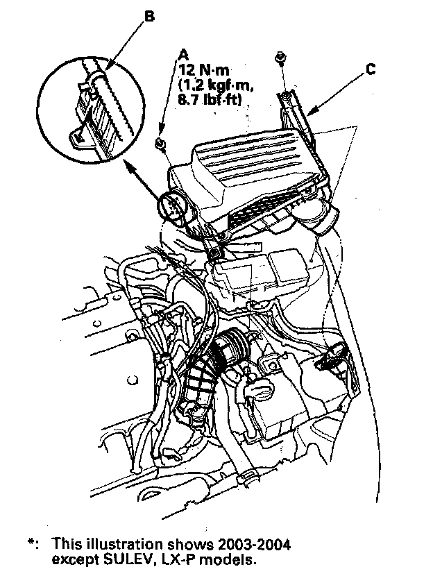 Air Cleaner Removal/Installation1. Remove the bolts (A) and the clamp (B) (2003-2004 SULEV, LX-P models, and 2005-2006 models: