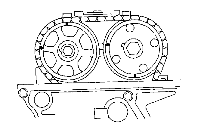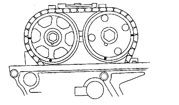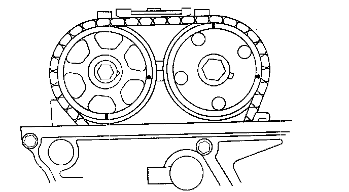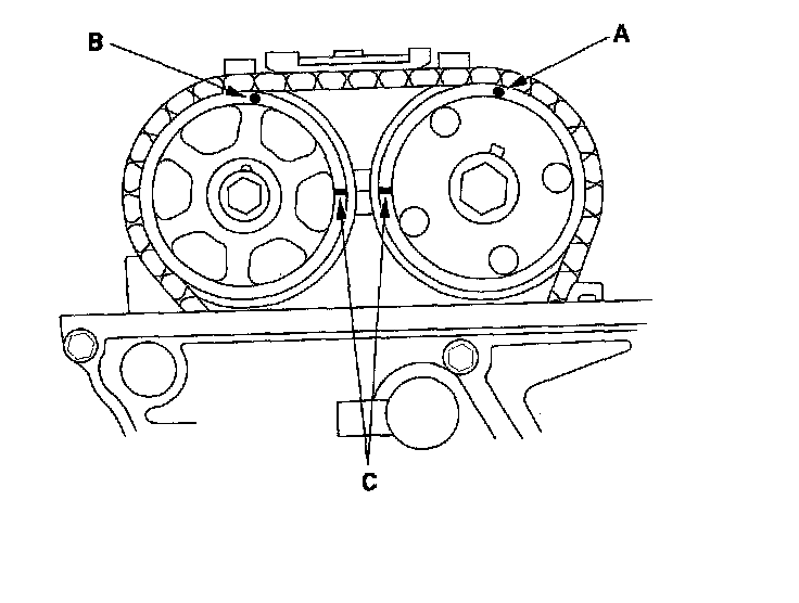2. Set the No. 1 piston at top dead center (TDC). The punch mark (A) on the variable valve timing control (VTC) actuator and the punch mark (B) on the exhaust camshaft sprocket should be at the top. Align the TDC marks (C) on the VTC actuator and exhaust camshaft sprocket.