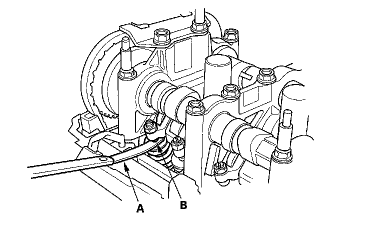 4. Insert the feeler gauge (A) between the adjusting screw (B) and the end of the valve stem, and slide it back and forth; you should feel a slight amount of drag.