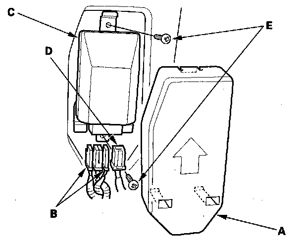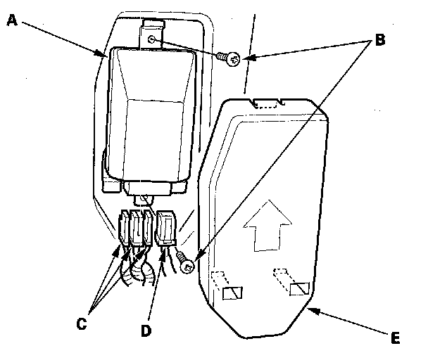 1. Place the new OPDS/ODS unit (A) on the seat-back frame. Tighten the two screws (B), and connect the OPDS unit harness 8P/ODS unit harness 18P connector D and sensor connectors (C) to the OPDS/ODS unit. Reinstall the cover (E).