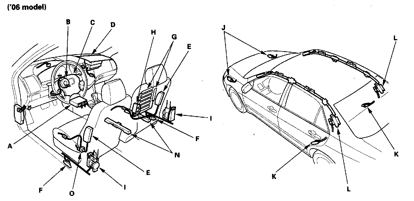 The SRS is a safety device which, when used with the seat belt, is designed to help protect the driver and front passenger in a frontal impact exceeding a certain set limit. The system consists of the SRS unit, including safing sensor and impact sensor (A), the cable reel (B), the driver's airbag (C), the front passenger's airbag (D), side airbags (E), side curtain airbags (L), seat belt tensioners (1), front impact sensors (J), side impact sensors (first) (F) and side impact sensors (second) (K).