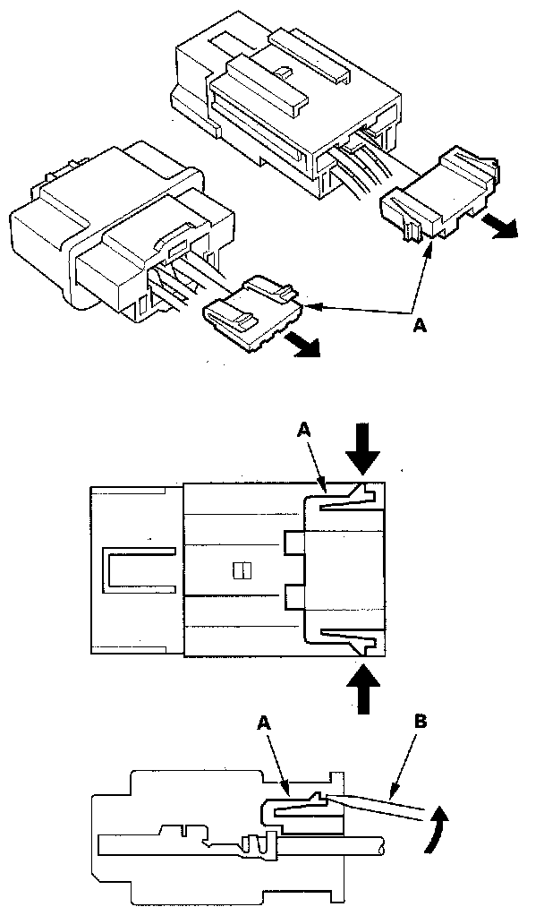 To remove the retainer (A), insert a flat-tip screwdriver (B) between the connector body and the retainer, then carefully pry out the retainer. Take care not to break the connector.
