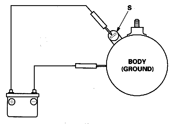 1. Connect the battery to the starter as shown using as heavy a wire as possible (preferably equivalent to the wire used for the vehicle). To avoid damaging the starter, never leave the battery connected for more than 10 seconds.