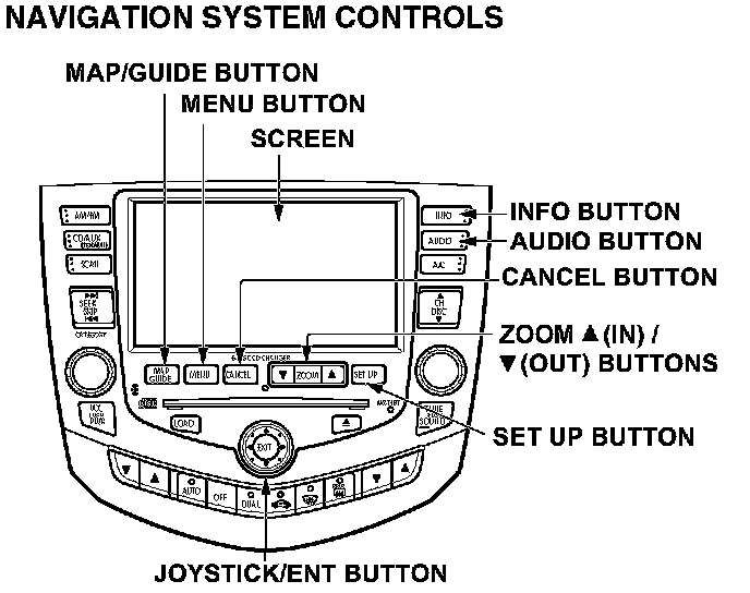 MAP/GUIDE button - Press to display the map screen. When en route, press this button to switch among the map, guidance, and direction list screens.