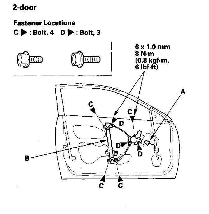 6. Remove the bolts (C), and loosen the bolts (D), then remove the regulator through the hole in the door.