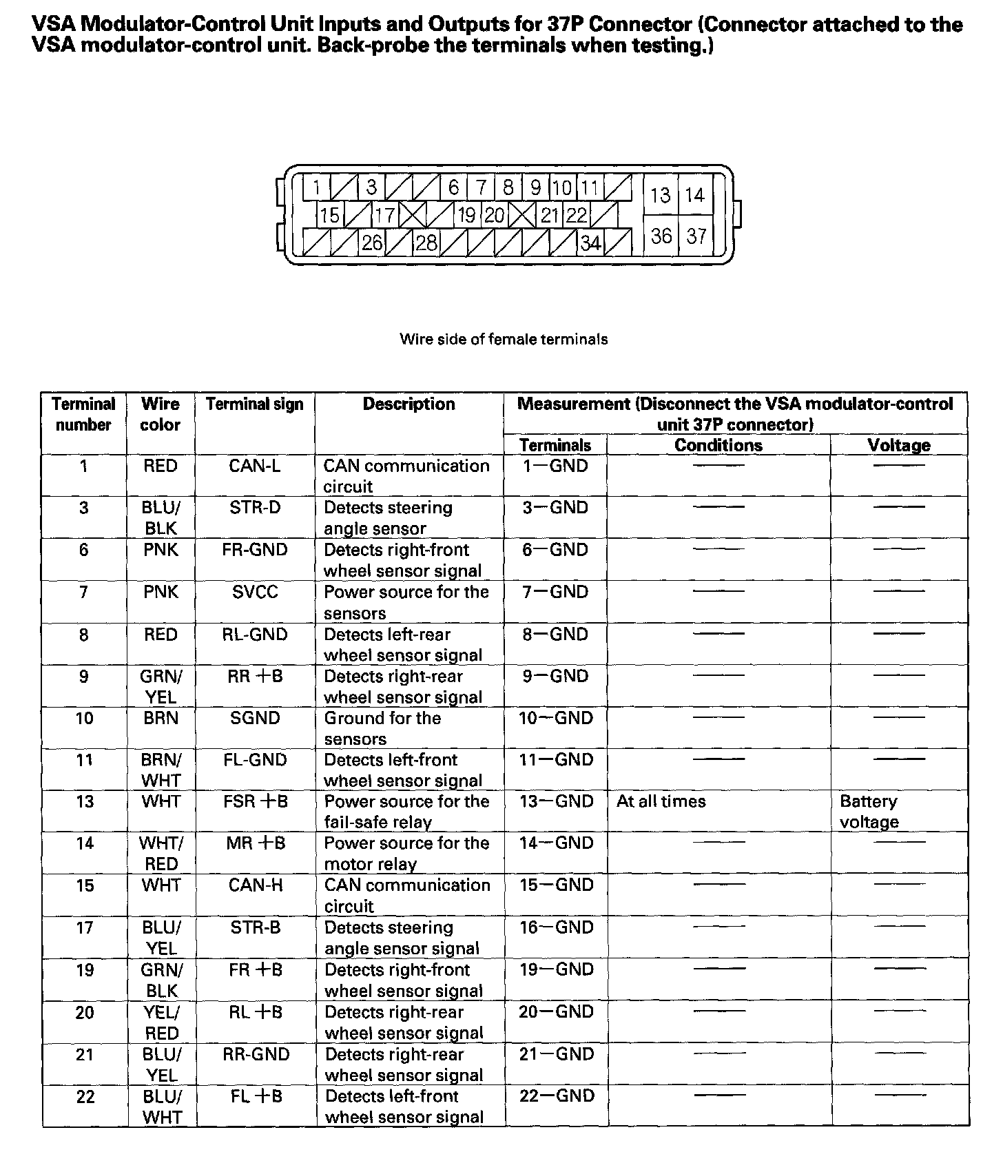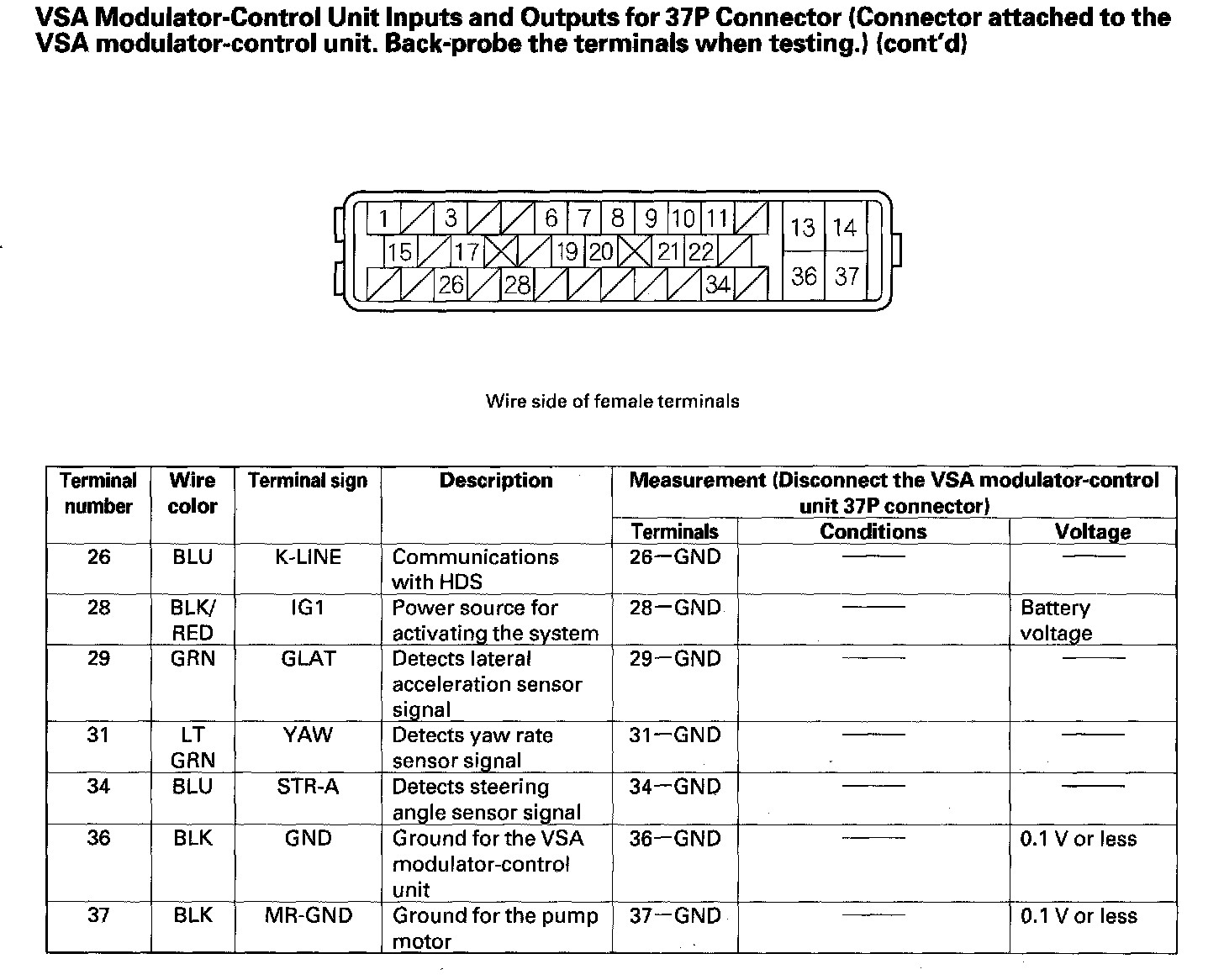 VSA Modulator-Control Unit Inputs and Outputs for 37P Connector (Connector attached to the VSA modulator-control unit. Back-probe the terminals when testing.)