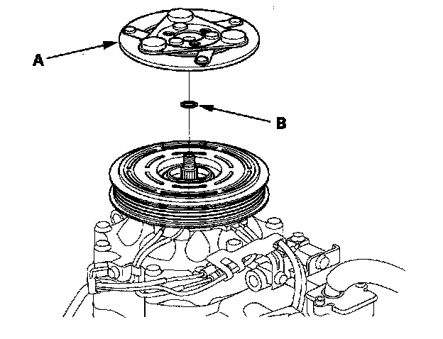 1. Remove the center nut (A) while holding the armature plate with a commercially available A/C clutch holder (B).