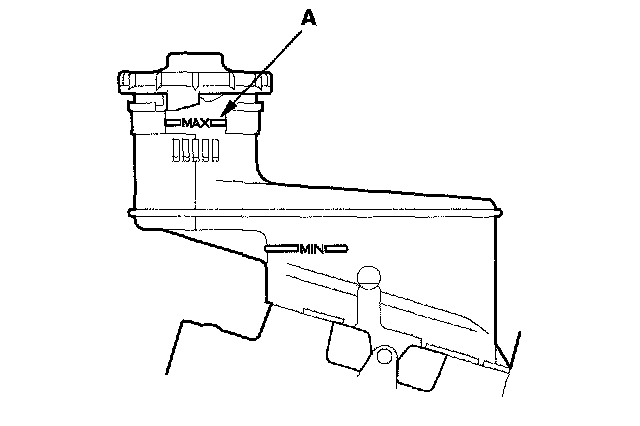 1. Make sure the brake fluid level in the reservoir is at the MAX (upper) level line (A).