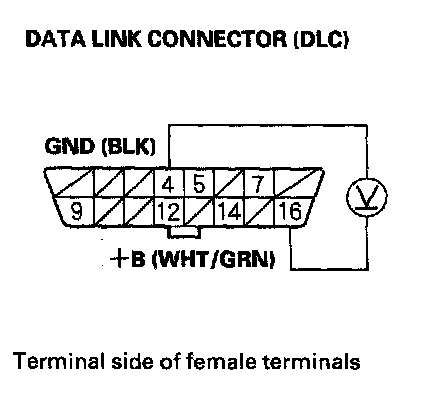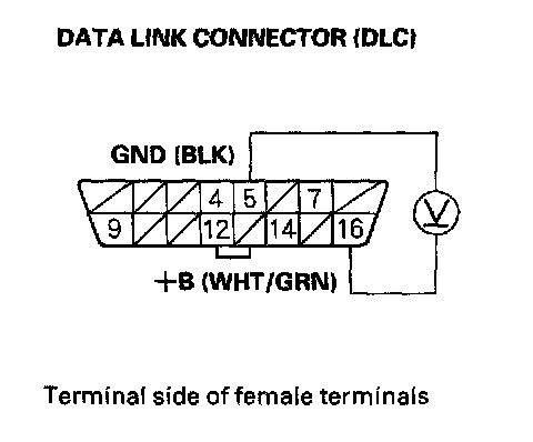 3. Measure voltage between DLC terminals No. 5 and No.16.