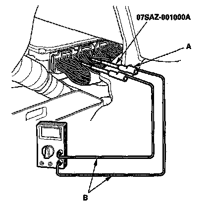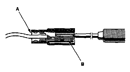 8. If you cannot get to the wire side of the connector or the wire side is sealed (A), disconnect the connector and probe the terminals (B) from the terminal side. Do not force the probe into the connector.