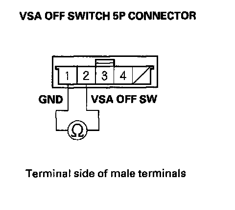 3. Check for continuity between VSA OFF switch connector terminal No. 1 and No. 2. There should be continuity when the switch is pushed.