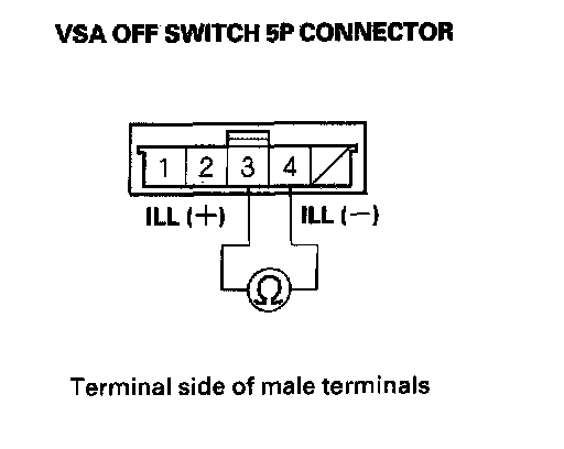 4. Check for continuity between VSA OFF switch connector terminal No. 3 and No. 4. There should be continuity at all times.