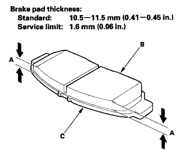 5. If the brake pad thickness is less than the service limit, replace all the brake pads as a set.