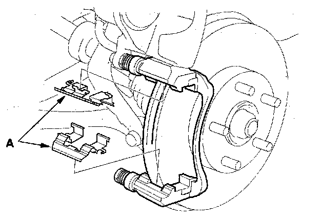 7. Remove the pad retainers (A), and check the caliper pins for free movement.