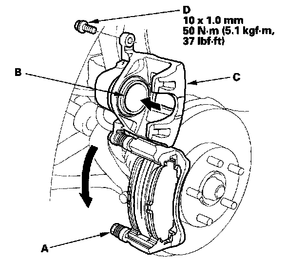 4. Remove the flange bolt (C) while holding the pin A with a wrench being careful not to damage the pin boot, and pivot the caliper (D) up out of the way. Check the brake hoee and pin boots for damage and deterioration.