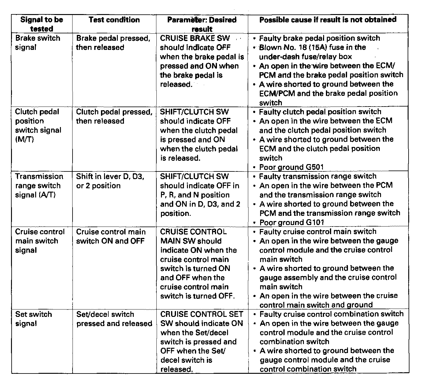 NOTE: Intermittent failures are often caused by loose circuit connections. While monitoring cruise control inputs, flex their circuits, and note if any of the test result change.