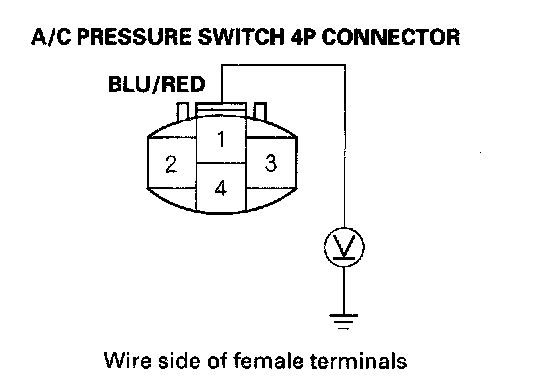 4. Measure the voltage between the No. 1 terminal of the A/C pressure switch 4P connector and body ground.