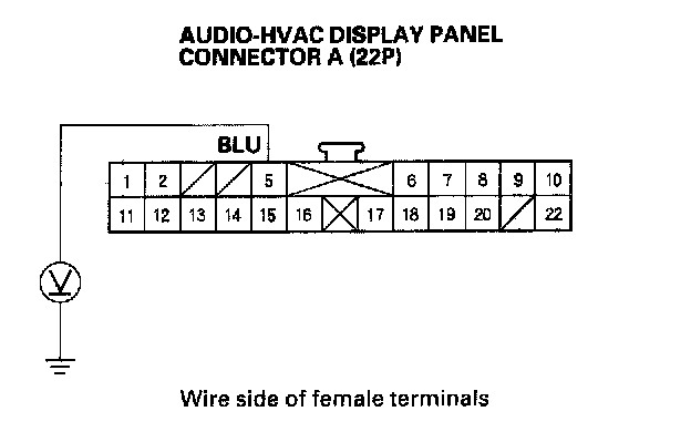 10. Measure the voltage between the No. 5 terminal of audio-HVAC display panel connector A (22P) and body ground.