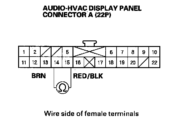 12. Measure the resistance between the No. 14 and No. 15 terminals of audio-HVAC display panel connector A (22P).