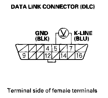15. Measure voltage between DLC terminals No. 5 and No. 7.