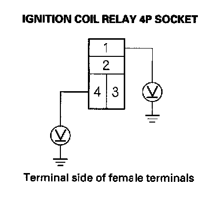 3. Measure the voltage between ignition coil relay 4P socket terminal No. 1 and body ground, then terminal No. 4 and body ground.