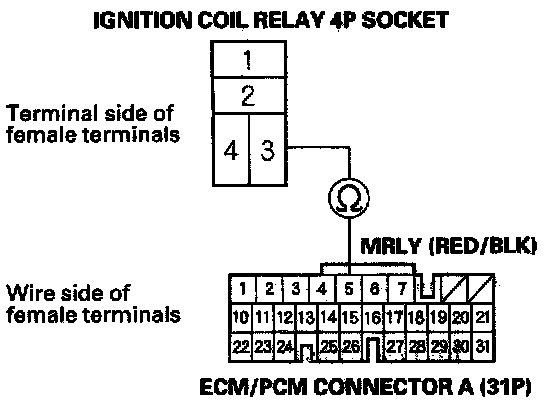 6. Check for continuity between ignition coil relay 4P socket terminal No. 3 and engine control module (ECM)/powertrain control module (PCM) connector terminal A5.
