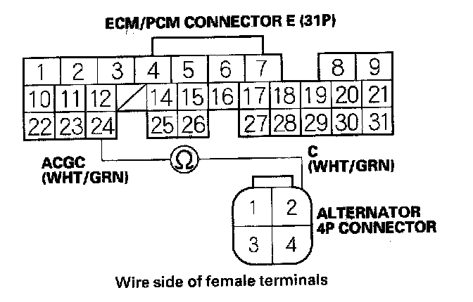 11. Check for continuity between ECM/PCM connector terminal E24 and alternator 4P connector terminal No. 2.