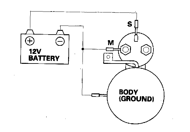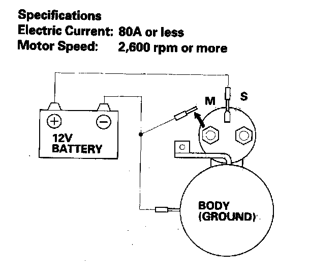 2. Make a connection as shown using as heavy a wire as possible (preferably equivalent to the wire used for the vehicle). To avoid damaging the starter, never leave the battery connected for more than 10 seconds.