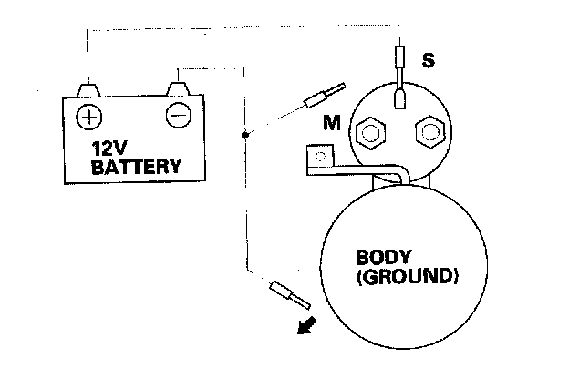 4. Disconnect the battery from the M terminal. If the pinion does not retract, the hold-in coil of the solenoid is working properly.