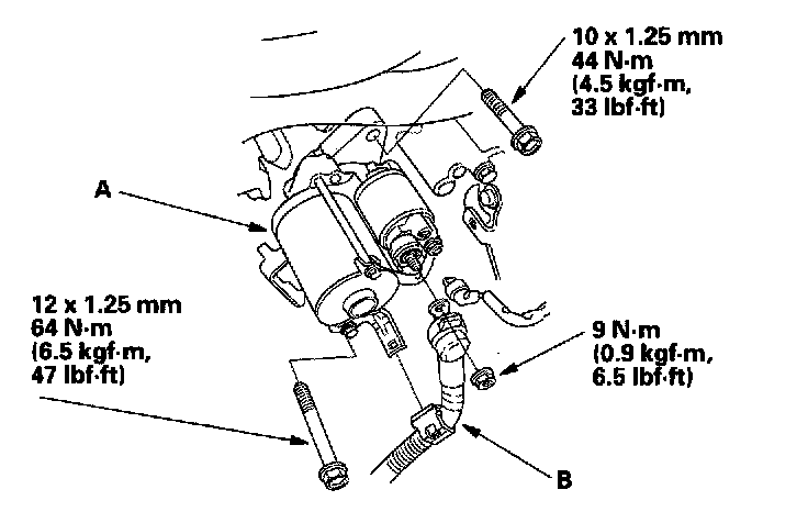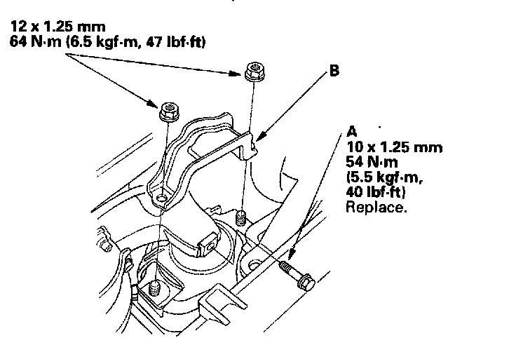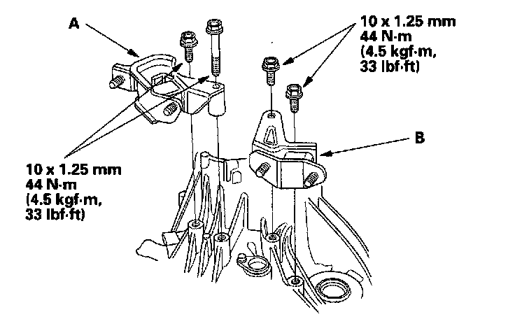3. Install the transmission front lower mount (A) and the transmission rear lower mount (B).