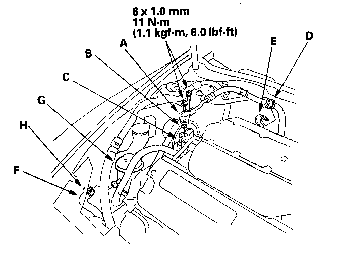 32. Connect the return the hose (F) to the power steering fluid reservoir (G), then secure the hose with its clamp (H).