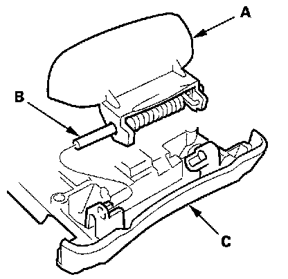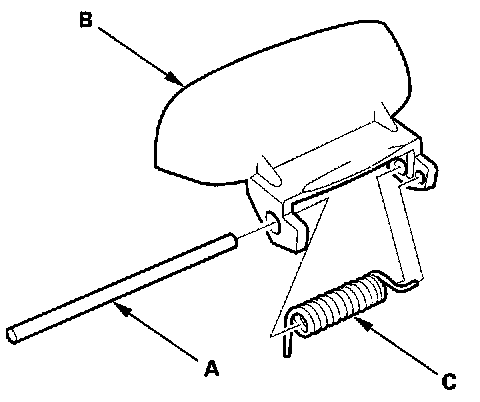 7. Remove the armrest lock pin (A), then separate the armrest lock (B) and armrest lock spring (C).