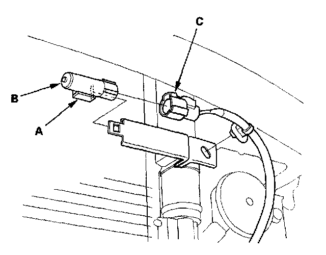 2. Lift the tab (A) to release the lock, then remove the outside air temperature sensor (B) from the receiver/dryer desiccant bracket. Disconnect the 2P connector (C) from the outside air temperature sensor.
