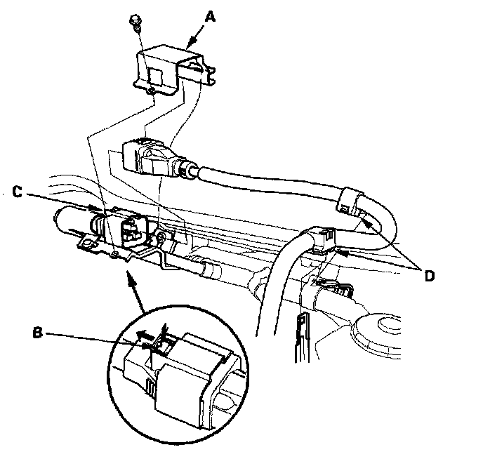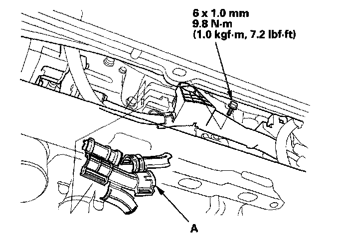 8. Remove the bolt and the shield connector cover (A). Slide the retainer (B), then disconnect the connector (C). Remove the wire harness clips (D).