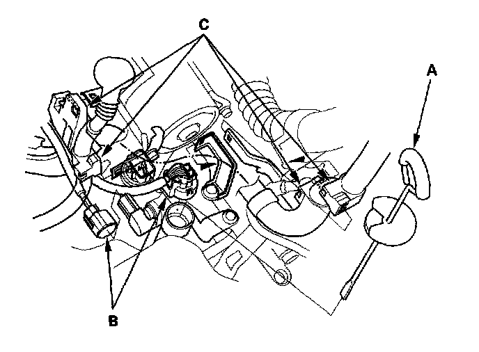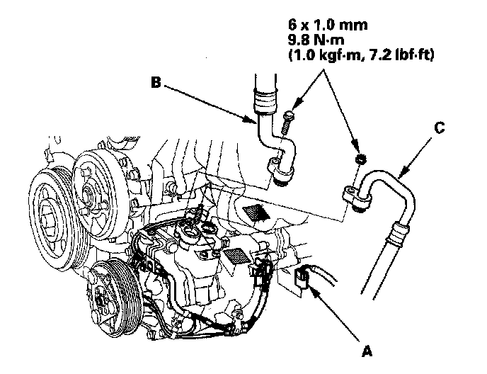 12. Disconnect the A/C compressor clutch connector (A). Remove the bolt and the nut, then disconnect the suction hose (B) and discharge hose (C) from the A/C compressor. Plug or cap the lines immediately after disconnecting them to avoid moisture and dust contamination.