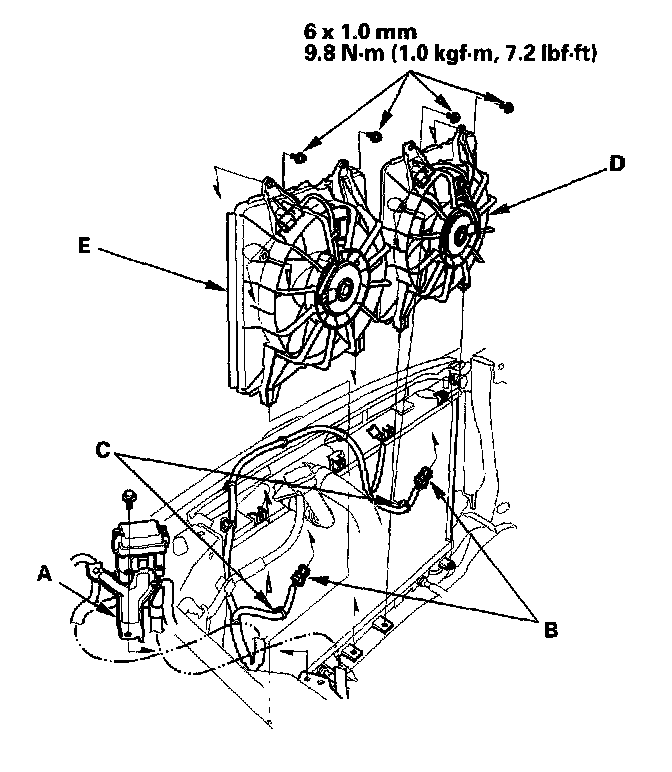 11. Remove the bolt and the auxiliary under-hood fuse/relay box bracket (A). Disconnect the connectors (B), then remove the wire harness clips (C). Remove the upper mounting bolts, the A/C condenser fan shroud (D), and the radiator fan shroud (E). Be careful not to damage the radiator fins when removing the A/C condenser fan shroud and radiator fan shroud.