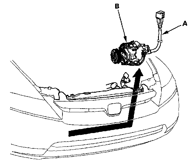 14. Pull out on the power cable (A), then lift up the A/C compressor (B).