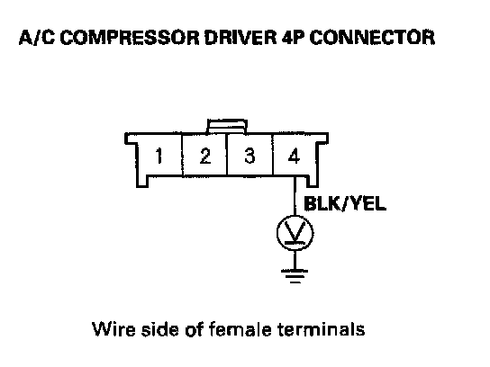 4. Measure the voltage between the A/C compressor driver 4P connector No. 4 terminal and body ground.
